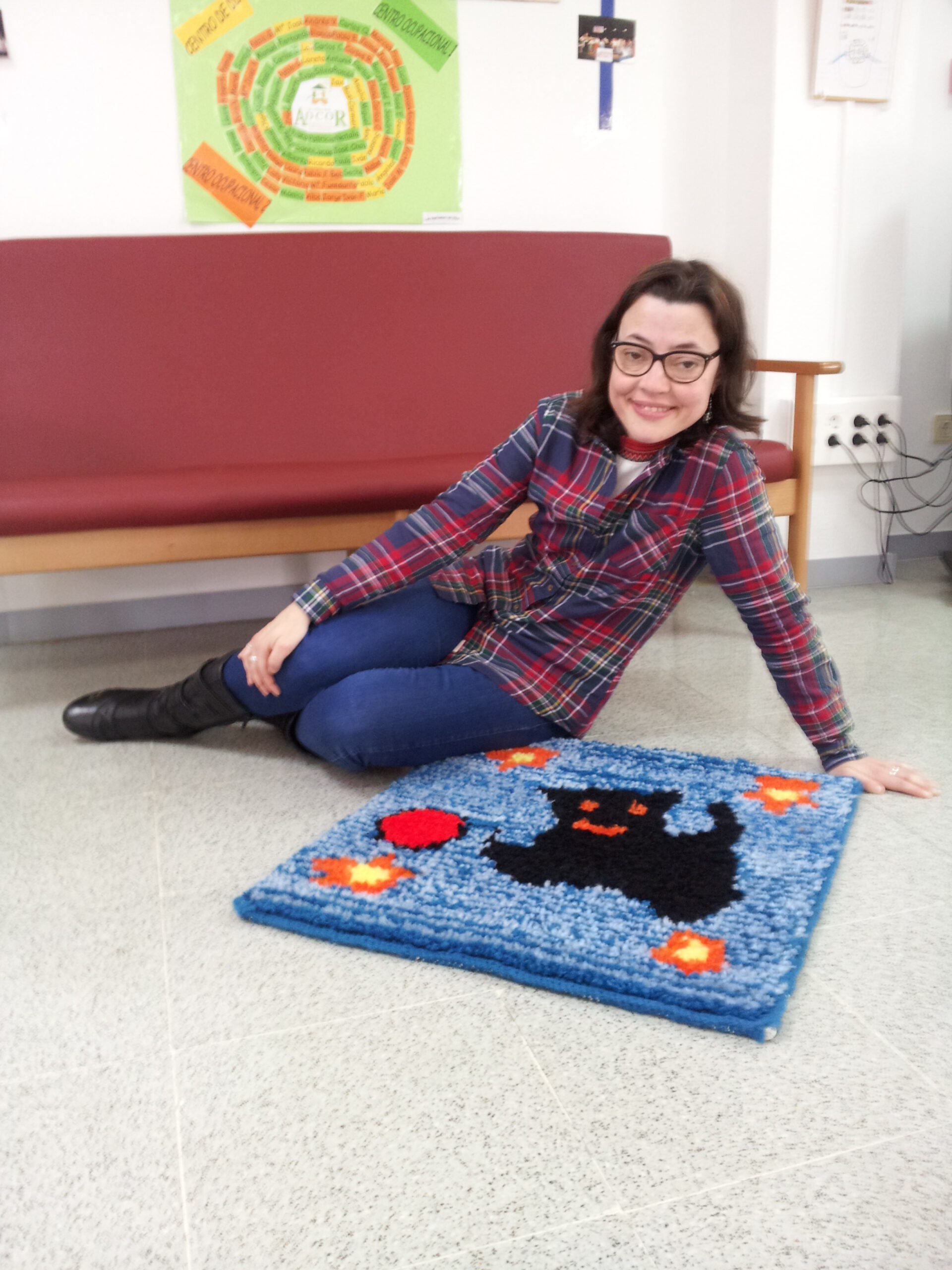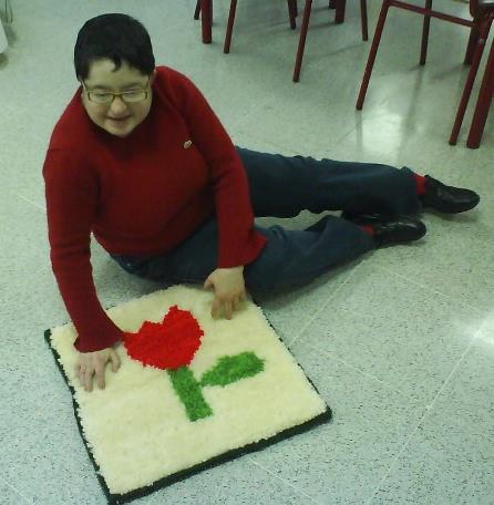 Mª José: “La alfombra es bonita. Aprendí en el colegio Príncipe Felipe de Pontevedra. En ADCOR he hecho una de un gato y estoy terminando otra de puzzle”.